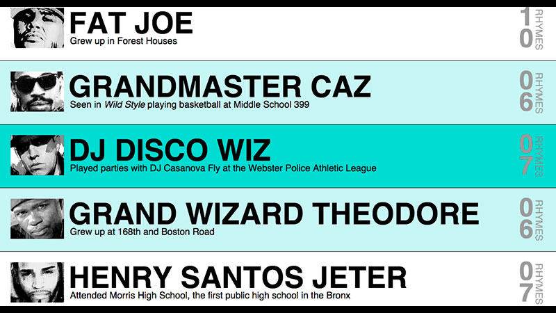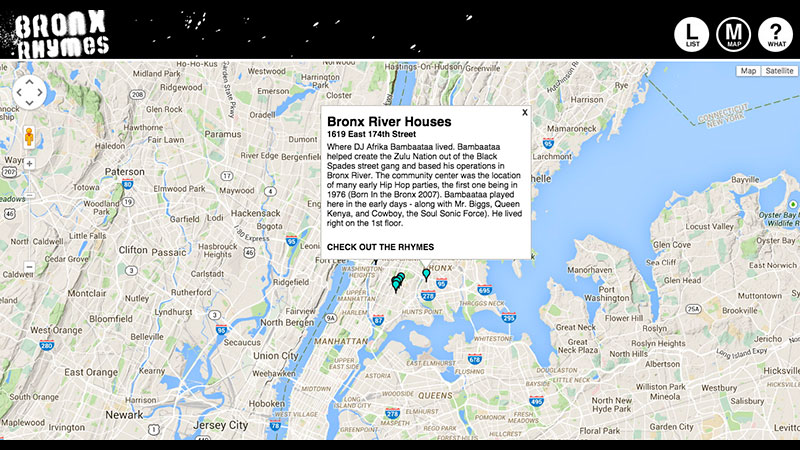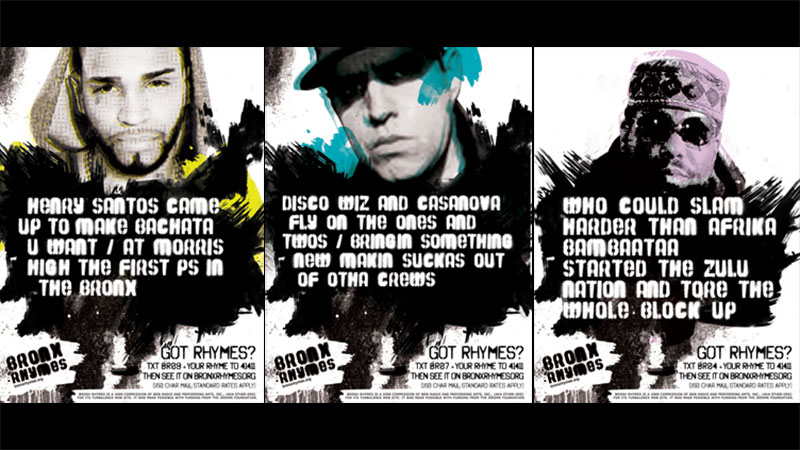 Bronx Rhymes visibiliza la historia y la importancia del Hip Hop en el Bronx mediante el etiquetado de lugares importantes para el Hip Hop (1520 Sedgwick, por ejemplo) con carteles. Cada póster describe el significado histórico de esa ubicación en forma de rima e invita a las personas que pasan por allí a unirse en una batalla de rimas al introducir su propia rima desde su teléfono móvil. El sitio web muestra los artistas y las ubicaciones junto con todas las rimas enviadas. Eventualmente, los visitantes del sitio web podrán calificar las rimas existentes y agregar las suyas propias.