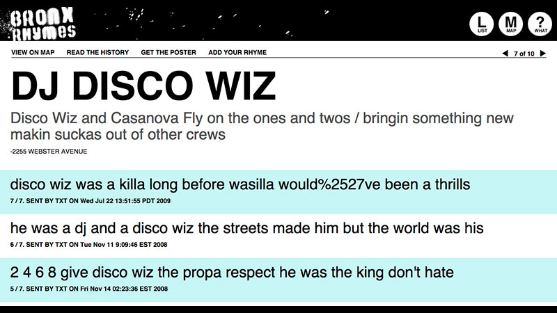 Bronx Rhymes illuminates the history and significance of Hip Hop in the Bronx by tagging important locations for Hip Hop (1520 Sedgwick, for example) with posters. Each poster describes the historical significance of that location in the form of a rhyme, and invites people walking by to join in a rhyming battle by txt-ing their own rhyme from their mobile phone. The website displays the artists and locations along with all the submitted rhymes elevating the most recent submission. Eventually, visitors to the website will be able to rate existing rhymes, and add their own.