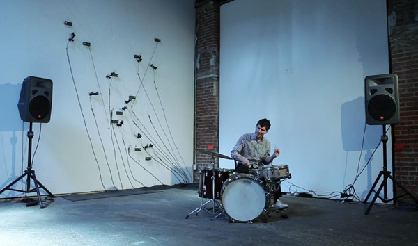 Eli Keszler (Drums, Crotales, Installation) performing with the L-Carrier installation Eyebeam, New York City, June 2012 |