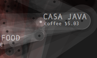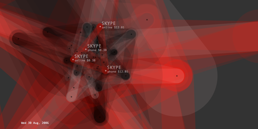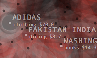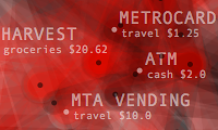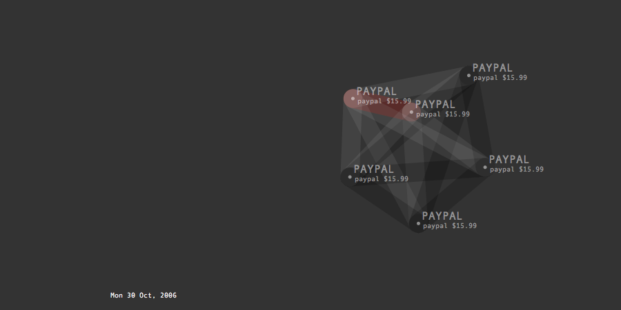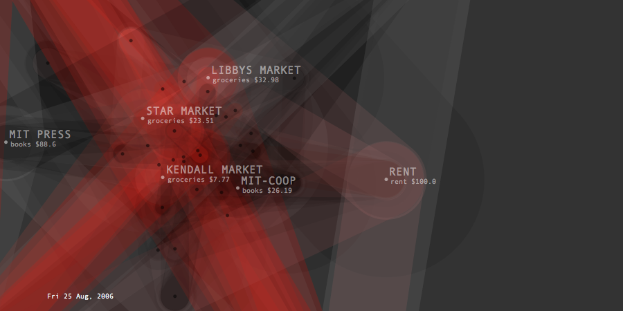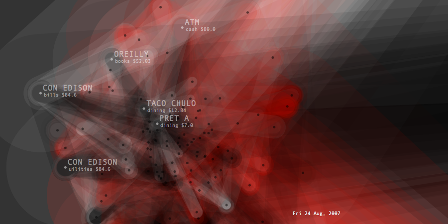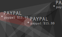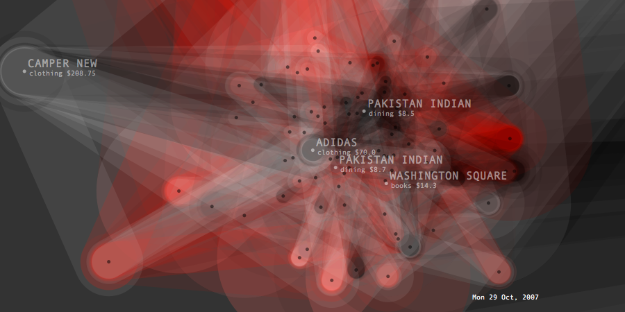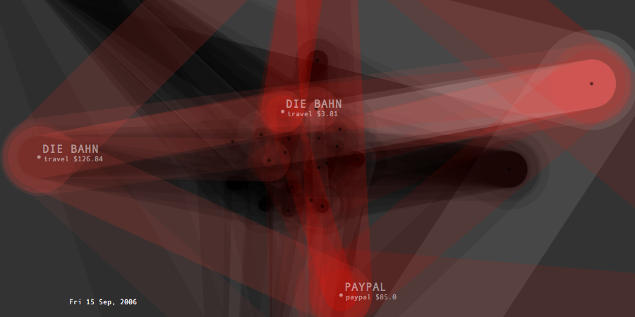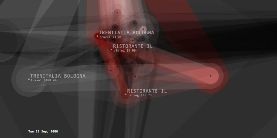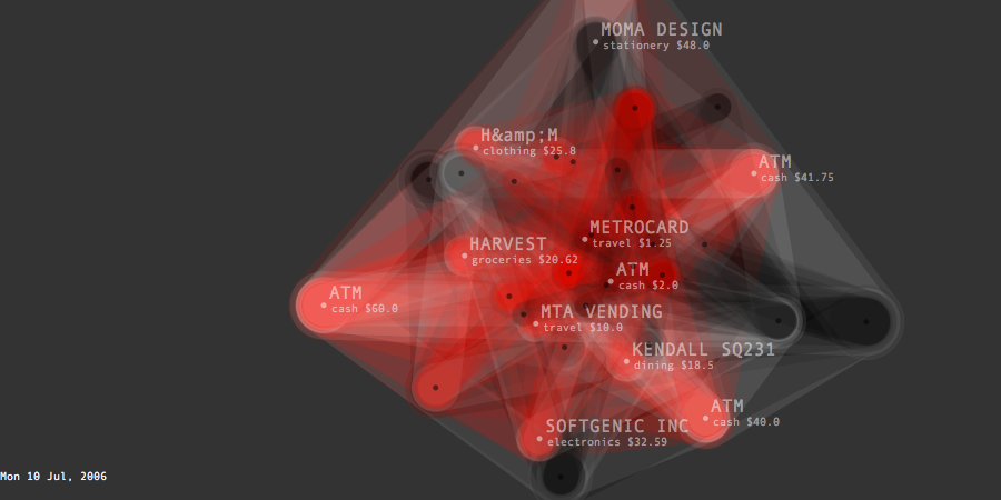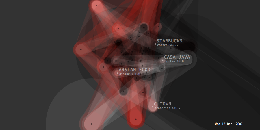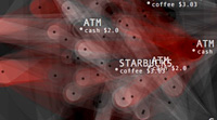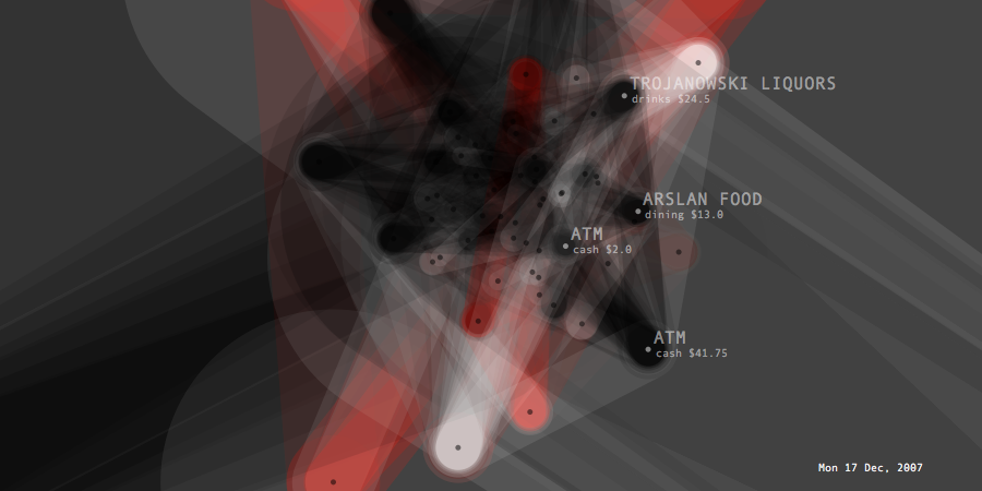 Transactions Graph is the network model created to generate list of predictions about future spending. It shows the unprocessed model of dynamic relationships between transaction items and their effects changing overtime. Its topology intensifies or de-inensifies depending on the quality and force of the relations. Each node represents a transaction and connected to each other through categories and dates. Thickness of connecting lines shows the total spending amount of the paired transactions. At a given timeframe, the last day's purchases and the two weeks of past spending are shown.