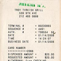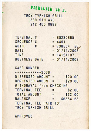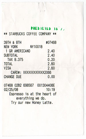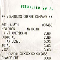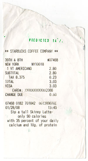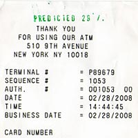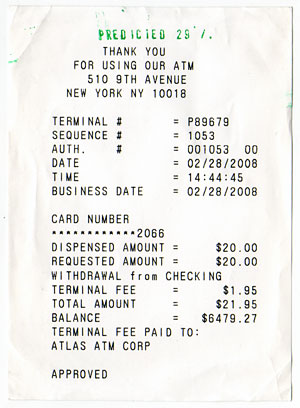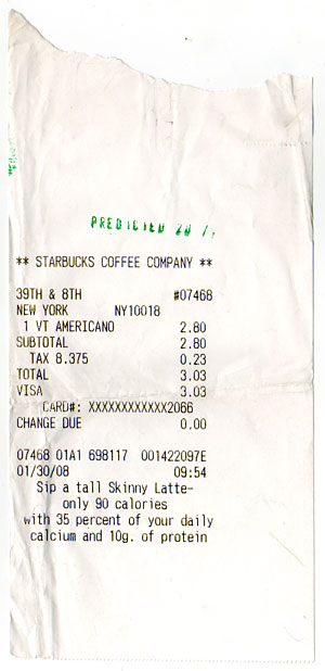 The receipts of the predicted transactions become predicted objects. After a predicted transaction happens, its receipt is marked with a green stamp, which shows the probability of the prediction. Each marked receipt is a unique object, not only because it contains unique transaction information, but also its existence was known. A predicted object is the physical evidence of a future event, it is only produced if the event happens. Predicted objects are the products of deliberate analysis and living, they are the readymades found in the future.