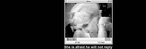 Nel database di “Turbulence” ci sono lavori che ci danno la possibilità di analizzare le performance on line e di rintracciare la sperimentazione di questo “nuovo corpo”. Iniziamo questa ricognizione, guardando al lavoro di Tina La Porta Distance del 1999 (9). Si trartta di una riflessione sulla possibilità di incontrare persone attraverso il Cuseeme software, un software di video conferenza in uso dal 199 , in cui una webcam consente alle persone di vedersi chattando singolarmente o in gruppo. Sono semplici immagini in bianco e nero che hanno ancora qualcosa di magico. Inutile dire che come accade in molti primi lavori di net art, questa magia è data dall’assenza di suono e in questo caso anche dall’assenza di colore. La net art ha generato, com’è noto, una sorta di shock nel pubblico, ha proposto un luogo d’interazione on line fruito da molti giovani artisti dai primi anni Novanta. Il web ha infatti realizzato una nuova possibilità di ascolto e di visibilità on line che prima non era possibile. Prima del web “essere on line” significava prendere parte a tutta una serie di intimità, di scambi interpersonali, che non implicavano il surfare nelle pagine web. Questo è il motivo per il quale il nuovo utente web è chiamato scherzosamente “interpassività”: un’utenza nuova e più passiva, già guastata da chiassosi film e dalla TV a colori. Uno schermo, che mostra esclusivamente del testo, ed alcune semplici immagini, sembrano una degradazione indotta dall’estetica mediale ed affascinano. I suoni rubati, il movimento fluente e in casi come Distance la mancanza di colore, danno spazio ad uno schermo “amputato”, luogo di una nuova e sociale interazione, dove la tecnologia e i suoi utenti, sono parte dello stesso sviluppo. Distance così è un lavoro sintomatico di una riflessione sulla vulnerabilità, riferendosi ad un doppio aspetto. L’assenza di suono aumenta il senso di consapevolezza del fruitore e crea una singolare bolla tra utente e schermo e al tempo stesso realizza una speciale connessione tra i due. Così l’immagine si muove senza suono mentre il movimento connesso al cliccare diventa innaturale.
