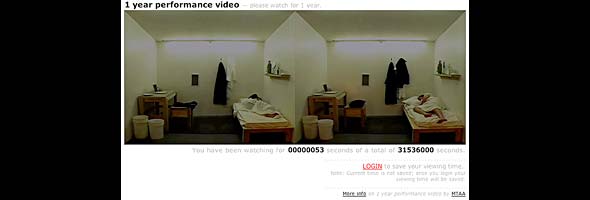 Se mettiamo a confronto Distance con un altro progetto di “Turbulence”, 1 Year Performance Video (12) di MTAA vediamo che le dinamiche che scatenano l’attrazione emotiva sono in enorme contrasto con il precedente. Il lavoro di MTAA è la traduzione di una performance di Sam Hsieh nella quale l’artista si chiuse letteralmente nel suo studio per un anno nel 1978(13). Nella soluzione tecnologica di quest’idea gli artisti si sono ovviamente liberati dai confini fisici che Hsieh voleva enfatizzare. M. River e T. Whid hanno stavolta connesso alcuni loro video con un’applicazione software dando l’illusione di un web cast dal vivo: come se fossero chiusi, a loro volta, in studio. Non c’è nessuna attenzione per stratagemmi tecnici in questa riemanazione, nella quale i due sono esclusivamente enfatizzati da questa situazione che al tempo stesso disperde l’ipotetico “coinvolgimento emotivo”. 1 Year Performance Video è stato così chiamato, anche, per citare la tradizionale moda di riesplorare vecchi lavori, immettendo una soluzione che cita anche il mondo dei videogiochi. Quello proposto è infatti una sorta di lavoro/videogioco d’arte nel quale non c’è un prezzo: il tutto funziona infatti, se l’ipotetico visitatore entra in contatto più volte con il sito nell’arco di un anno, con tanto di lista dei nomi dei migliori giocatori. L’attenzione è così catturata dalle trasformazioni tecnologiche. Potrebbe inoltre sembrare che l’utenza sia mutata, ma in realtà si ricrea la sintomatologia della performance di Sam Hsieh: poiché non è chiusa in una scatola, ma comunque stretta in una scatola. Si avverte l’illusione di uno spazio fisico dove i fruitori fanno solo quello che l’artista fa: delegando alla macchina il tutto. Lo scambio è di non dimenticare di girarci ogni volta che si è on line.