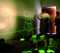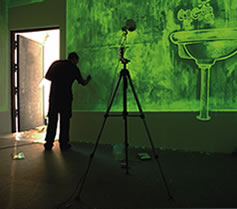 Trabajando sobre la propia memoria del museo y con el recuerdo de lo que antes fuera Prisión Preventiva y Correccional, el proyecto de Alonso Gil reproduce a escala ampliada una de las celdas que había en este edificio panóptico cuando todavía era cárcel. Con pintura fosforescente, una pintura que se carga con la luz y que se enciende en la oscuridad, ha pintado sobre sus paredes y su techo convirtiendo la habitación en un gran dibujo. Cuando la luz se apaga, los “fantasmas” aparecen y salen a relucir trazos y consignas que nos muestran imágenes y textos como los que hubo en esas celdas en otro tiempo, generalmente alusivos al imaginario de la represión y la marginalidad, o que son recurrentes en el epítome del artista. El uso intencionado del graffiti como escritura pervertidora del orden permite a Gil recuperar para el proyecto incluso pintadas leídas en las calles de la ciudad, o alusivas a problemas de actualidad en la región. Concebido desde el ámbito de las prácticas artísticas que pretenden re-significar el binomio arte-vida en la dialéctica resistencia-creación , el proyecto desarrollado para La Celda Grande identifica ese espacio marginalizado, liminar, y conflictivo en donde el lenguaje callejero se cruza con el del otro excluido y en donde el juego se ilumina con lo transgresor y lo intencionadamente crítico. Su instalación en el museo se acompañó de una serie de dibujos de gran formato que el artista había realizado con diversas técnicas, principalmente acuarelas y emulsiones fotográficas y que a modo de bocetos de La Celda, eran igualmente alusivos a la memoria carcelaria y al contexto sociopolítico. Su propuesta se nutre de las experiencias, preocupaciones e intereses que desde el inicio de su trayectoria han venido caracterizándole como un artista polifacético. Alonso Gil (Badajoz, 1966) se formó en la Facultad de Bellas Artes de Sevilla. En 1989 expuso por primera vez en la Galería Ascan Crone de Hamburgo. En el 2000 fue becado por la Fundación Pollock Krasner. Desde entonces su producción se ha diversificado en los más diferentes medios y su obra ha sido amplia e internacionalmente expuesta. |