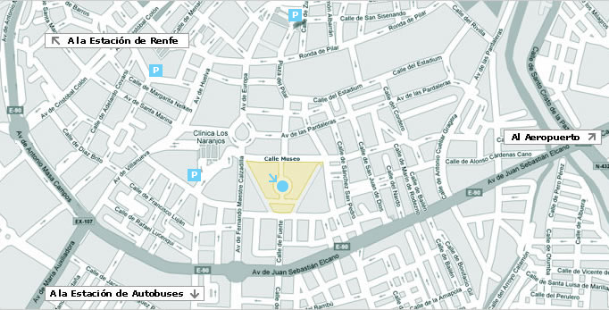 ![]() | Titularidad: JUNTA DE EXTREMADURA. Consejería de Cultura, Turismo y Deportes Dirección C/ Museo, s/n Badajoz - España Servicios Administrativos: C/ Virgen de Guadalupe, 7. Tfno.: 924 013060 Fax: 924 013082 E-mail: meiac@juntaex.es Medios de transporte: Líneas de autobuses: 3-4-5-6-7 Ferrocarril: RENFE: Av. Carolina Coronado s/n. Aeropuerto: Aeropuerto de Talavera La Real. A 14 km. del centro de la ciudad ![]() El más próximo se encuentra en Plaza de Conquistadores |